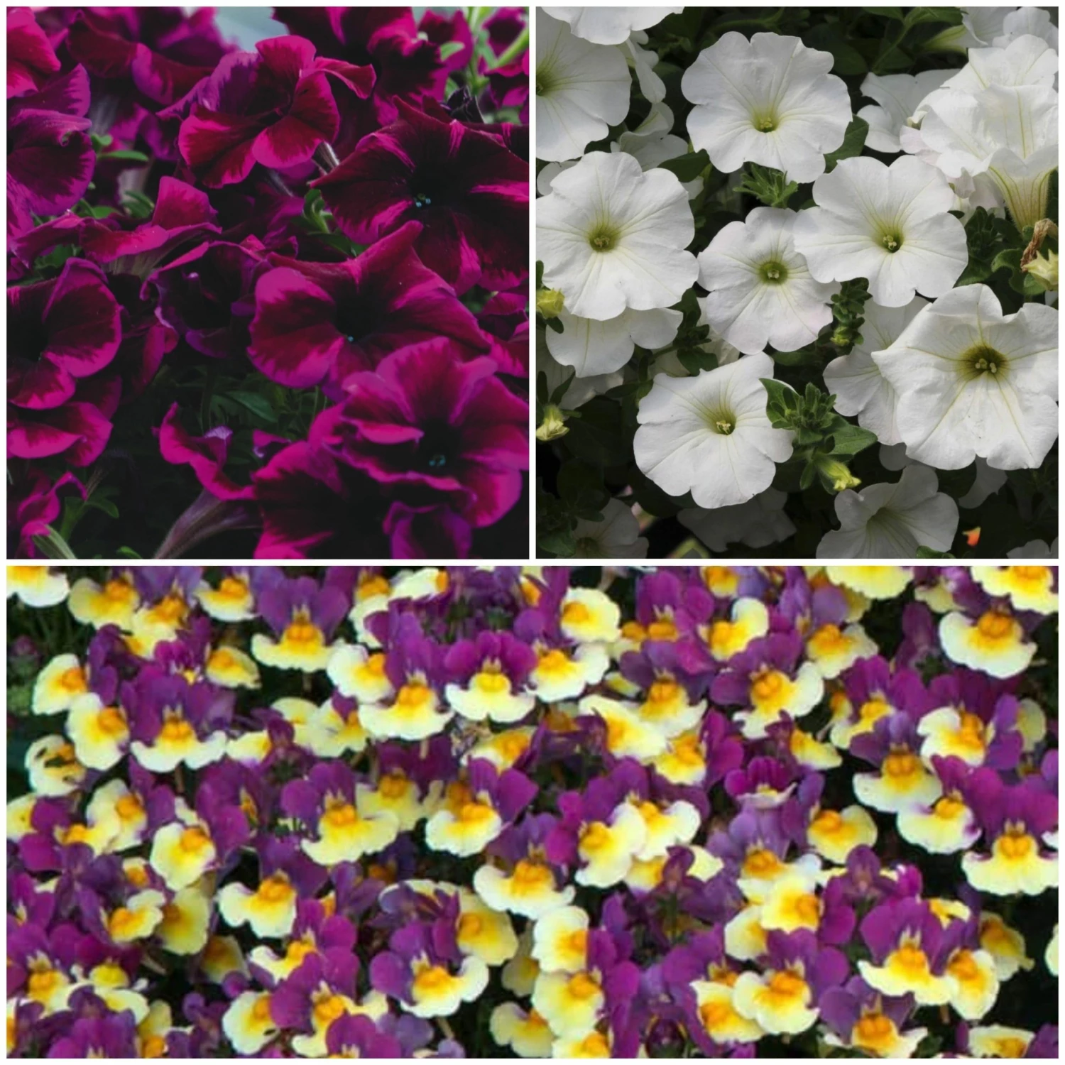 - 12 jumbo plug plants – the perfect amount for a full 30cm hanging basket or pot – including Nemesia Rhubarb and Custard, tumbling Petunia Surfinia Snow and Petunia Cosmic Purple