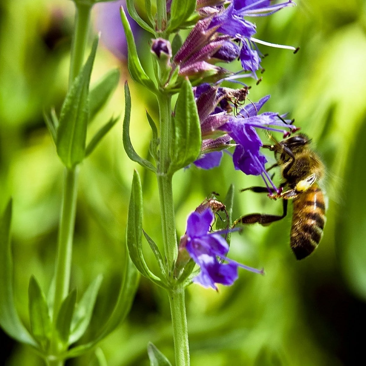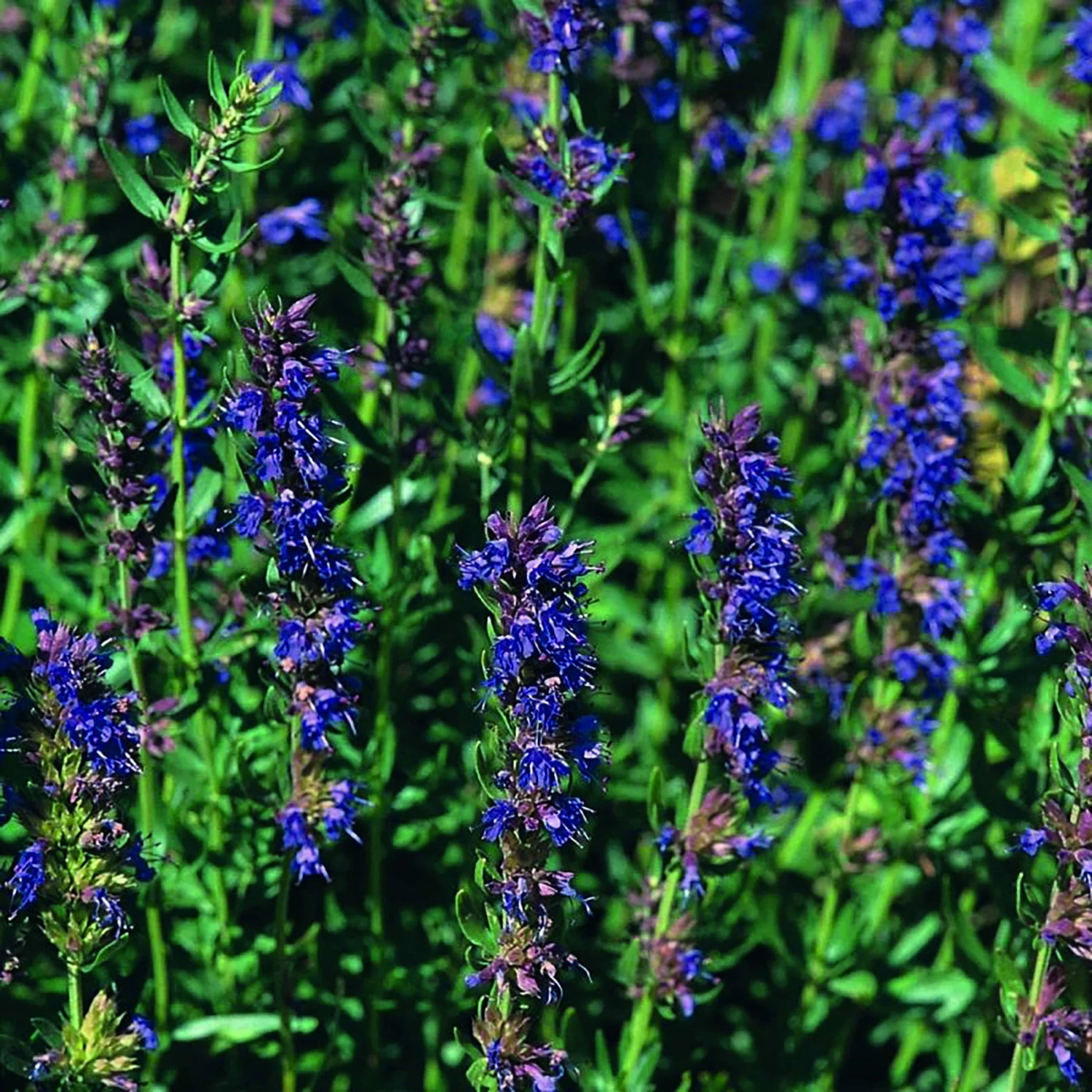 - Hyssop produces rich blue clusters of edible flowers that grow out of one side of its stem.