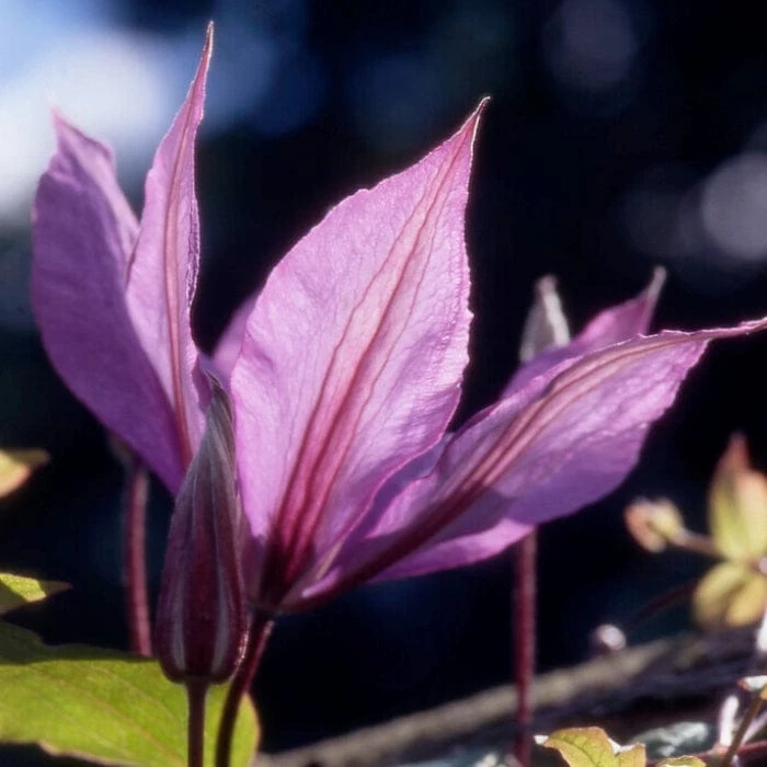 - A compact, large flowering clematis with masses of pink/lilac flowers up to 15cm across, with contrasting red anthers