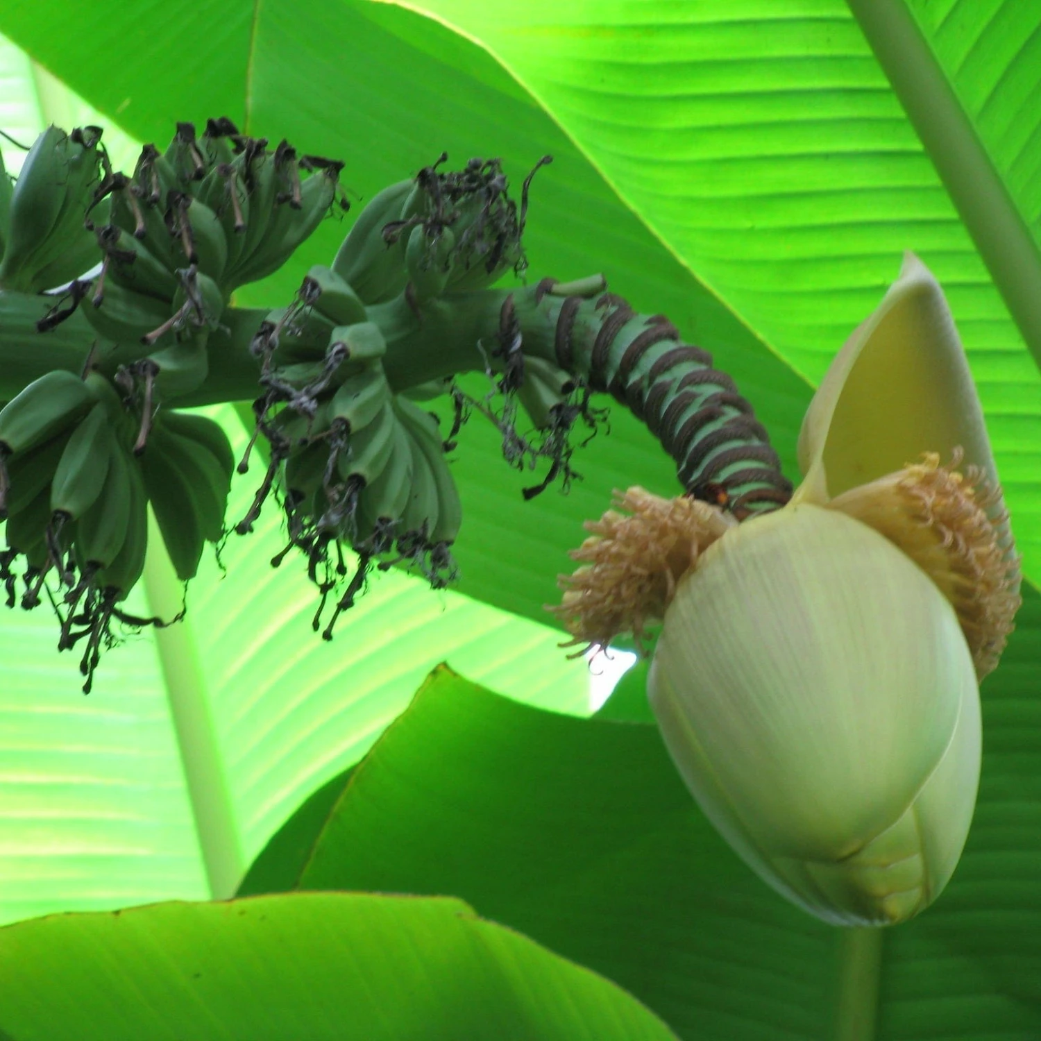 - A spectacular tall architectural plant with huge fan-like leaves up to 3m long and spikes of cream flowers sometimes followed by inedible green fruits