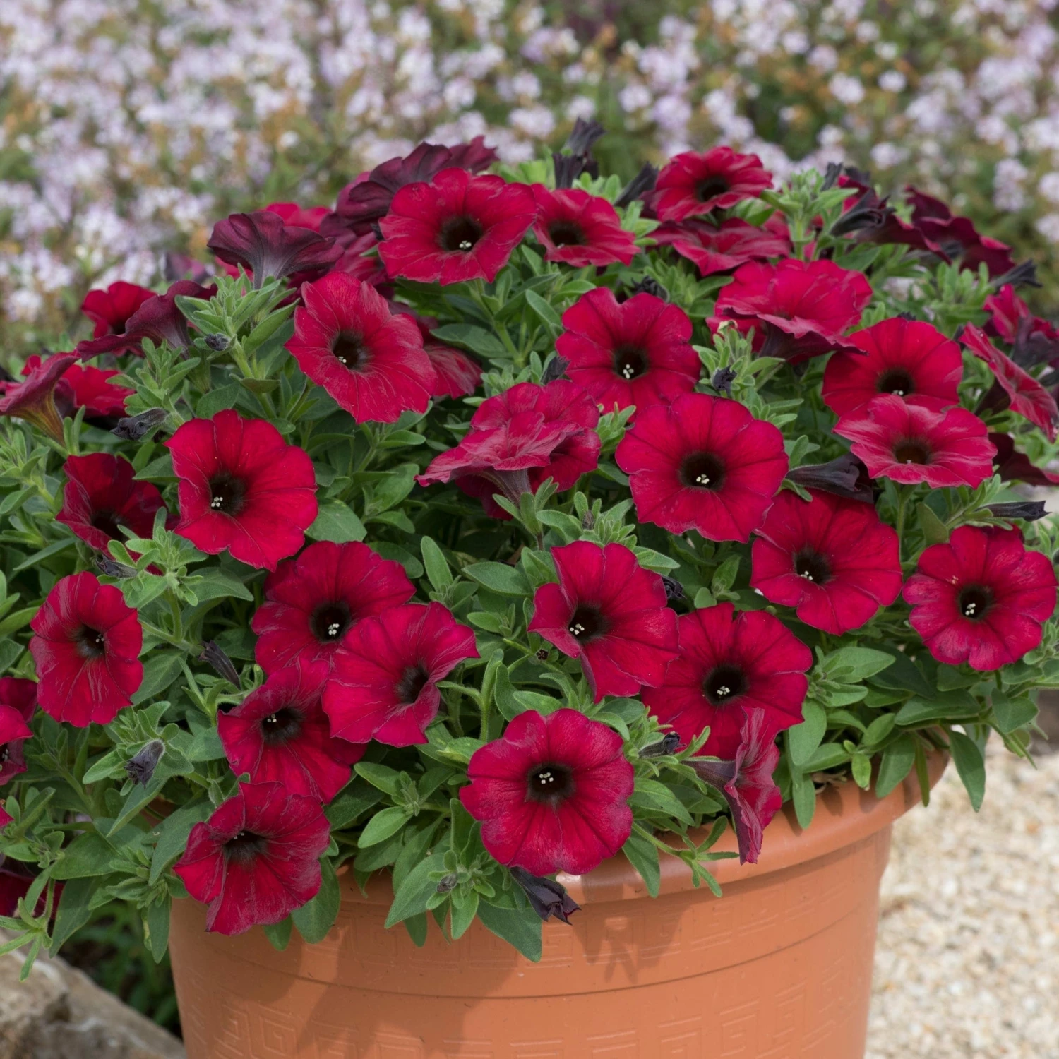 - This hybrid of Calibrachoa and Petunia has the best of both plants in a luscious velvety wine-red with a black centre