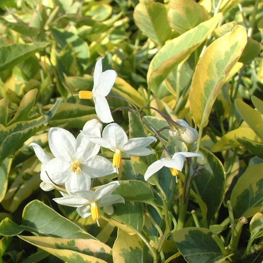 - An attractive and easy to care for climber with unusual green, yellow and cream variegated foliage and masses of starry white flowers all summer long